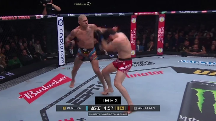 Анкалаев идет вперед на старте четвертого раунда, Перейра пытается поймать его левым боковым