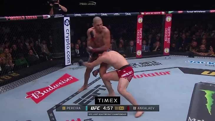 Анкалаев достаточно неплохо скрывал попытки переводов за ударами, но в итоге ни разу не уронил соперника. В первую очередь, причина в тактике Перейры. Он ни разу за бой не встречал тейкдаун на открытом мате. Даже если попытка прохода начиналась на расстоянии от стены, Перейра все равно успевал отойти и использовать ее в качестве опоры.