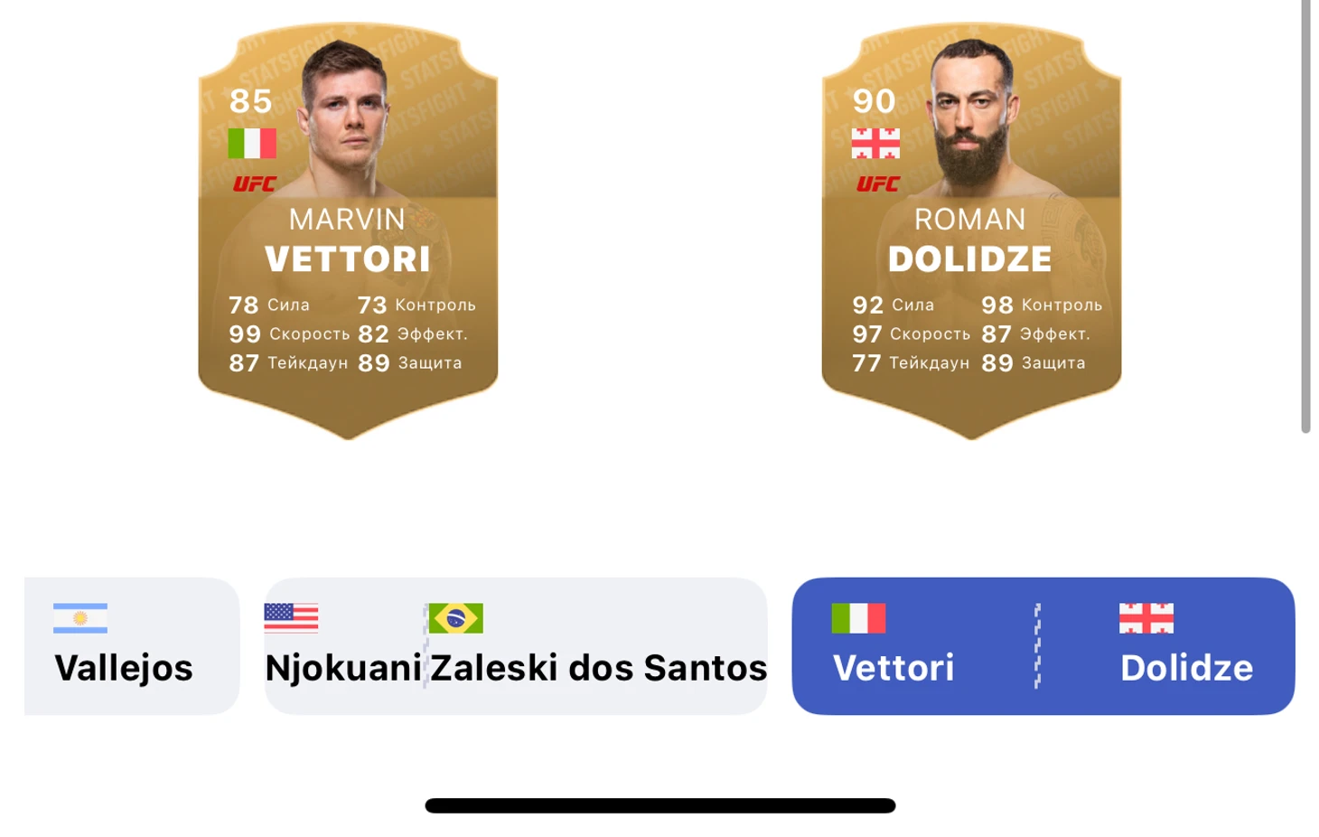 По данным Stats Fight Rating, бойцовский уровень Романа Долидзе выше, чем у его соперника. Навыки грузинского файтера наделены рейтингом 90. Что касается Марвина Веттори, то его характеристики оцениваются показателем 85.