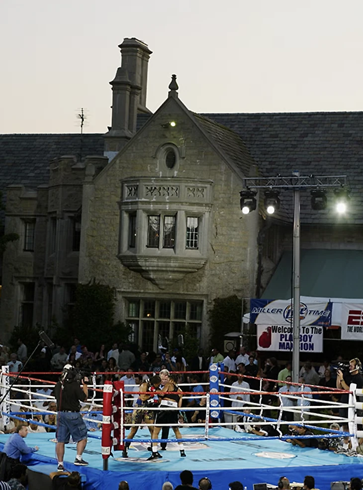 В мае-2000 Хефнер, которому было 73 года, провел боксерский турнир у себя в особняке Playboy Mansion. Выглядело максимально необычно: ринг поставили на теннисные корты возле особняка неофеодального стиля, с зоопарком и водопадом, кинотеатром и гидромассажными ваннами.