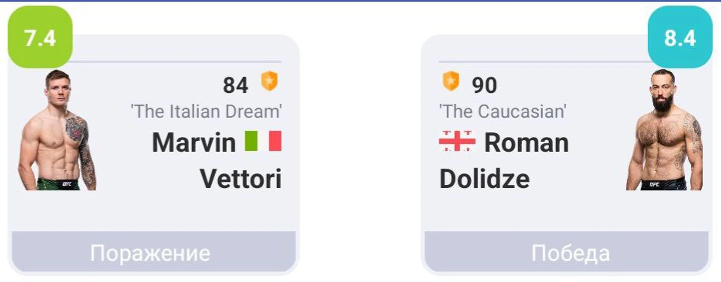 Алгоритм Stats Fight Performance по достоинству оценил выступление Романа Долидзе, который получил рейтинг 8.4 за минувший поединок. Что касается Марвина Веттори, то он достиг рейтинга 7.4.