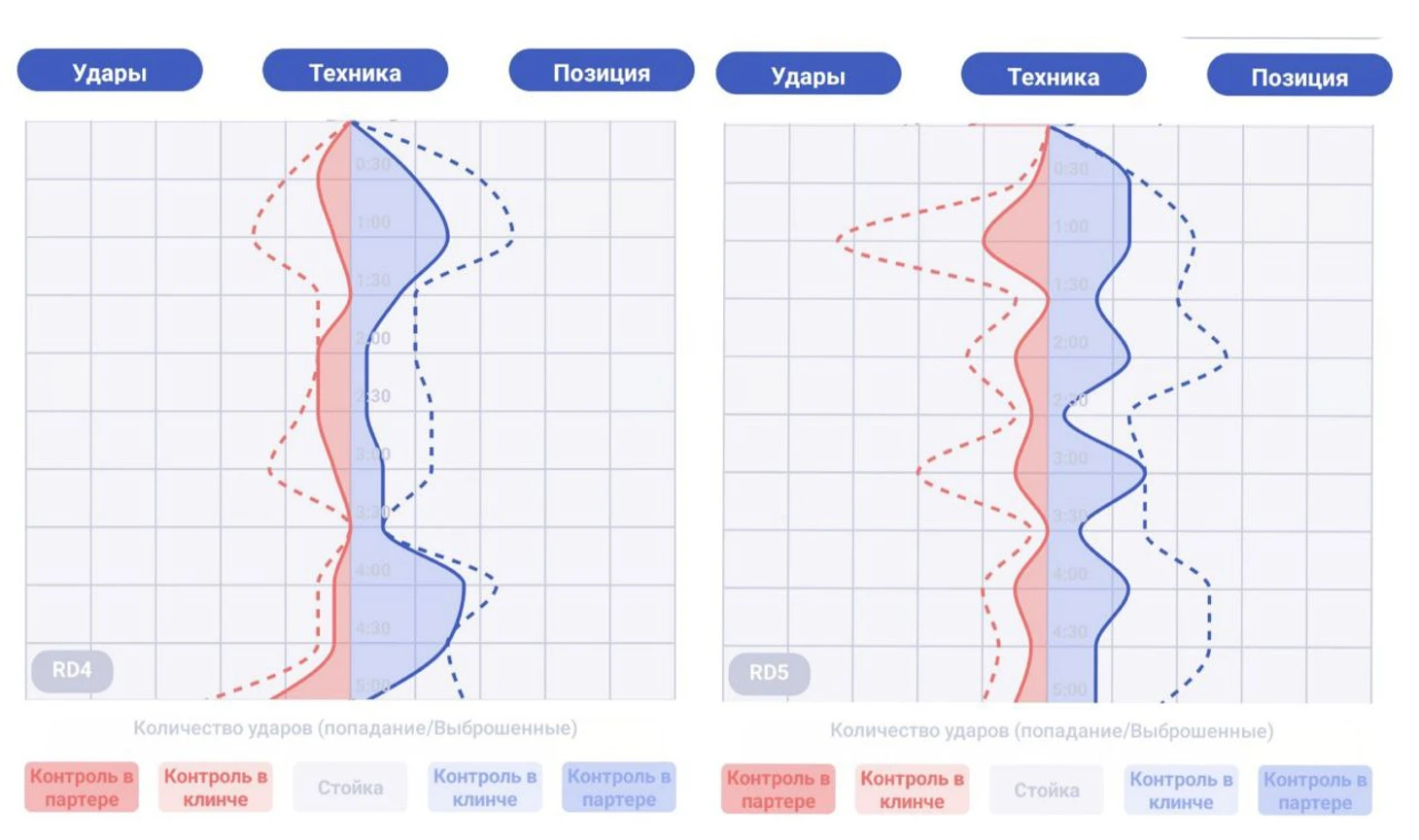 Экран “Динамика поединка” в приложении Stats Fight отлично показывает, что Роман был лучше Марвина в чемпионских отрезках: