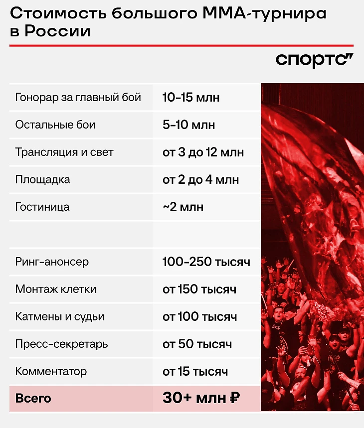 Аренда большой площадки в Москве уровня ЦСКА или «Дворца спорта Ирины Винер» стоит от ₽2 до 4 млн. Дальше в дело вступают нюансы: входит ли в стоимость работа охраны, уборка, кейтеринг и дополнительные услуги. Будет ли соглашение на один турнир или на несколько мероприятий. Есть ли давние деловые отношения у промоушена и владельцев площадки.