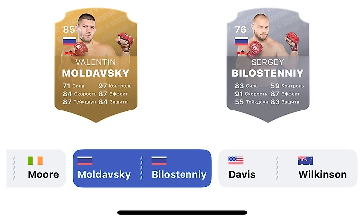 По данным Stats Fight Rating, Валентин Молдавский имеет более высокий бойцовский уровень. Его навыки оцениваются рейтингом 85. Сергей Билостенный отстает от своего соотечественника на девять пунктов, имея рейтинг 76.