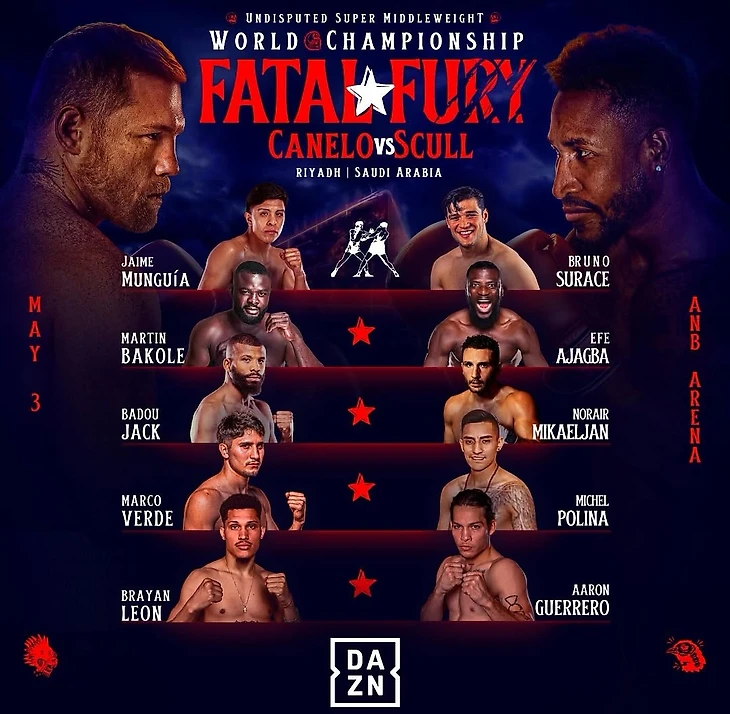 Первый из четырех поединков по новому соглашению Канело с Riyadh Season, и первое появление мексиканской суперзвезды на Ближнем Востоке. На кону встречи Канело-Скулл будет стоять звание абсолютного чемпиона мира: Альварес сейчас владеет титулами WBC, WBO и WBA, а в активе кубинца Скулла пояс IBF в суперсреднем весе. Канело считается королем этого дивизиона, и в этих весовых рамках еще никому не проигрывал.