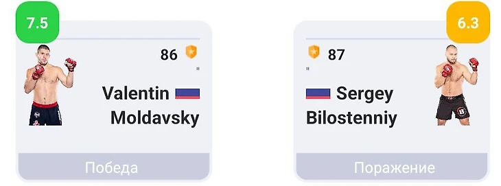 Алгоритм Stats Fight Performance по достоинству оценил выступление Валентина Молдавского. Ученик Федора Емельяненко получил рейтинг 7.5 за минувший поединок. Что касается Сергея Билостенного, то он достиг оценки 6.3.