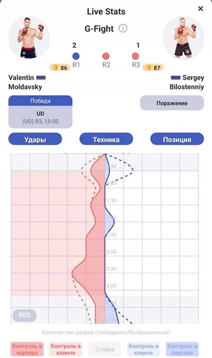 Прагматизм Молдавского принес свои плоды. Экран “Динамика поединка” в приложении Stats Fight подтверждает, что в третьем раунде он превзошел Билостенного по обьему атакующих действий: