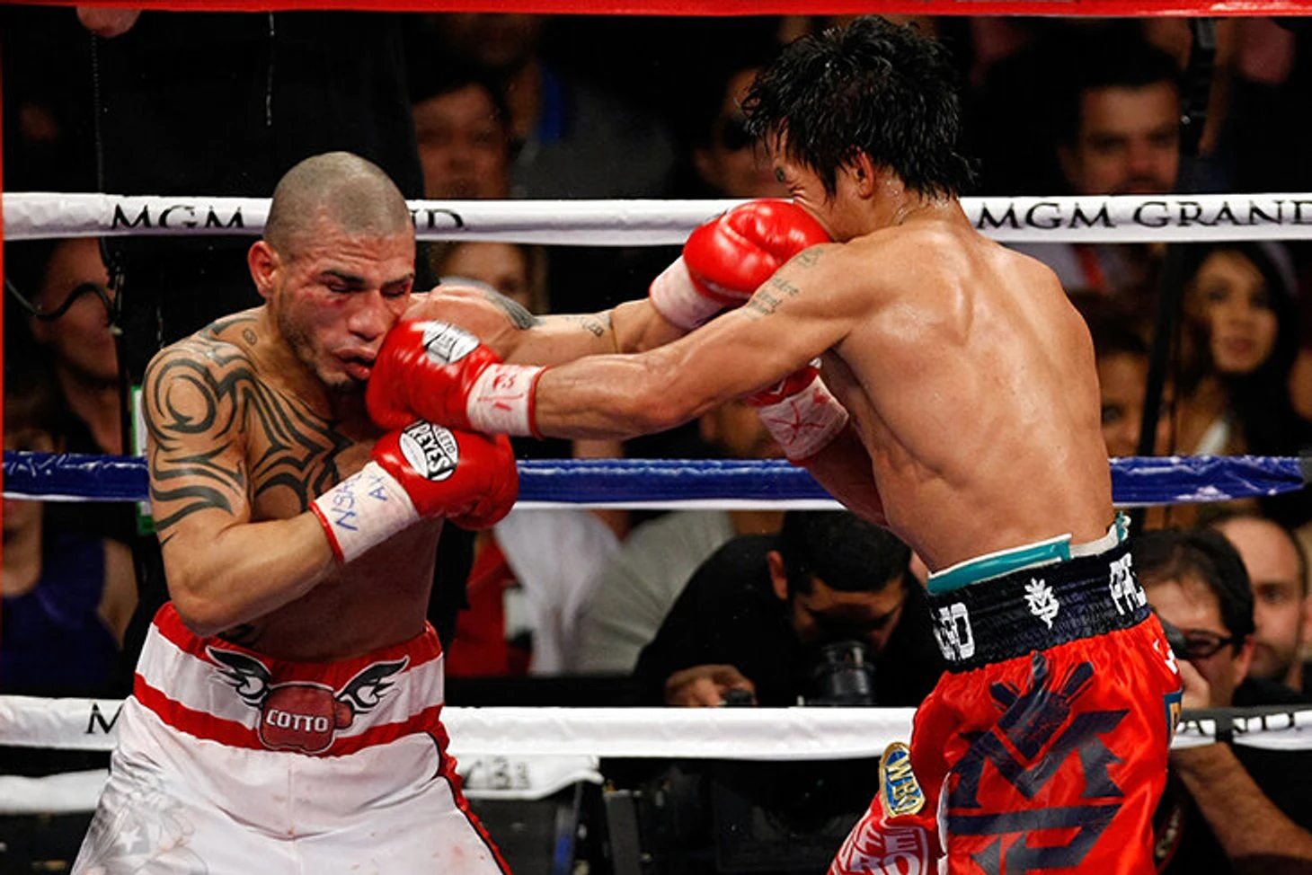 7. В 2010 году Пакьяо поднялся в первый средний вес ради боя с огромным панчером Антонио Маргарито – и это еще более опасный бой, чем со стареющим Де Ла Хойей. Итог – разгром и рекордные 474 попадания с точностью 44%. Из-за такого тоннажа оба глаза Маргарито заплыли. А Пакьяо стал чемпионом мира в восьмом весе.