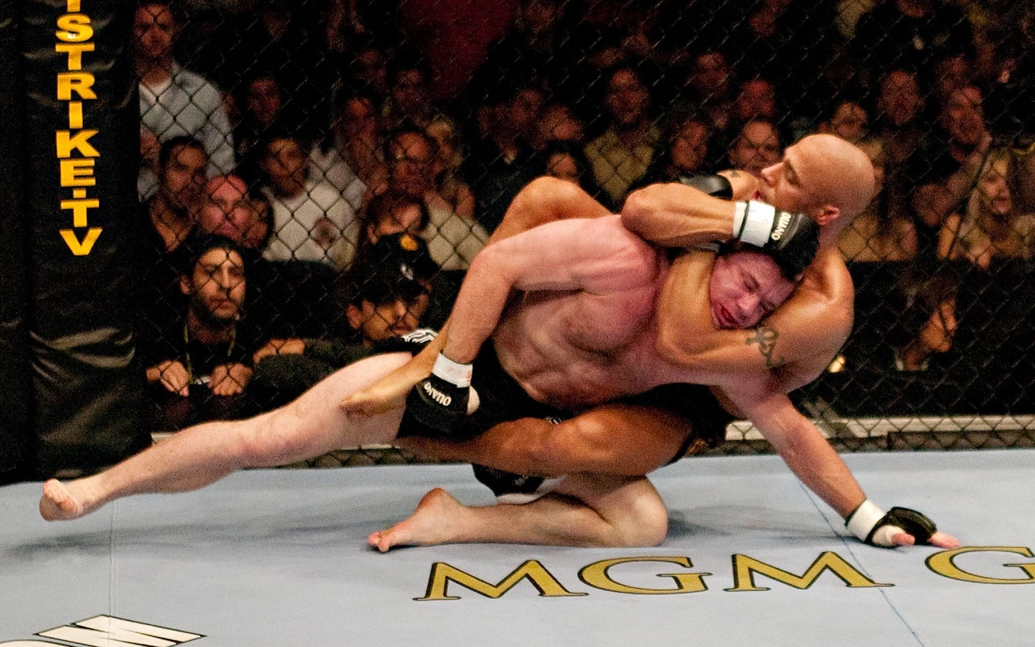 Один из самых драматичных поединков в истории богатого на подобные бои полусреднего веса. Это был не просто бой, а противостояние антиподов: герой в лице Хьюха противостоял злодею Триггу. И начало боя соответствовало всем канонам драматургии. Тригг нанес удар ниже пояса, который рейфери не заметил, и едва не задушил Хьюза. Но Мэтт перетерпел, поднял Тригга, отнес его в противоположный конец октагона и провел слэм, от которого, подозреваю, Триггу поплохело. После эттого Хьюз закрыл собственный удушающий. Потрясающий бой, который заслуживает статуса одного из лучших в истории UFC.