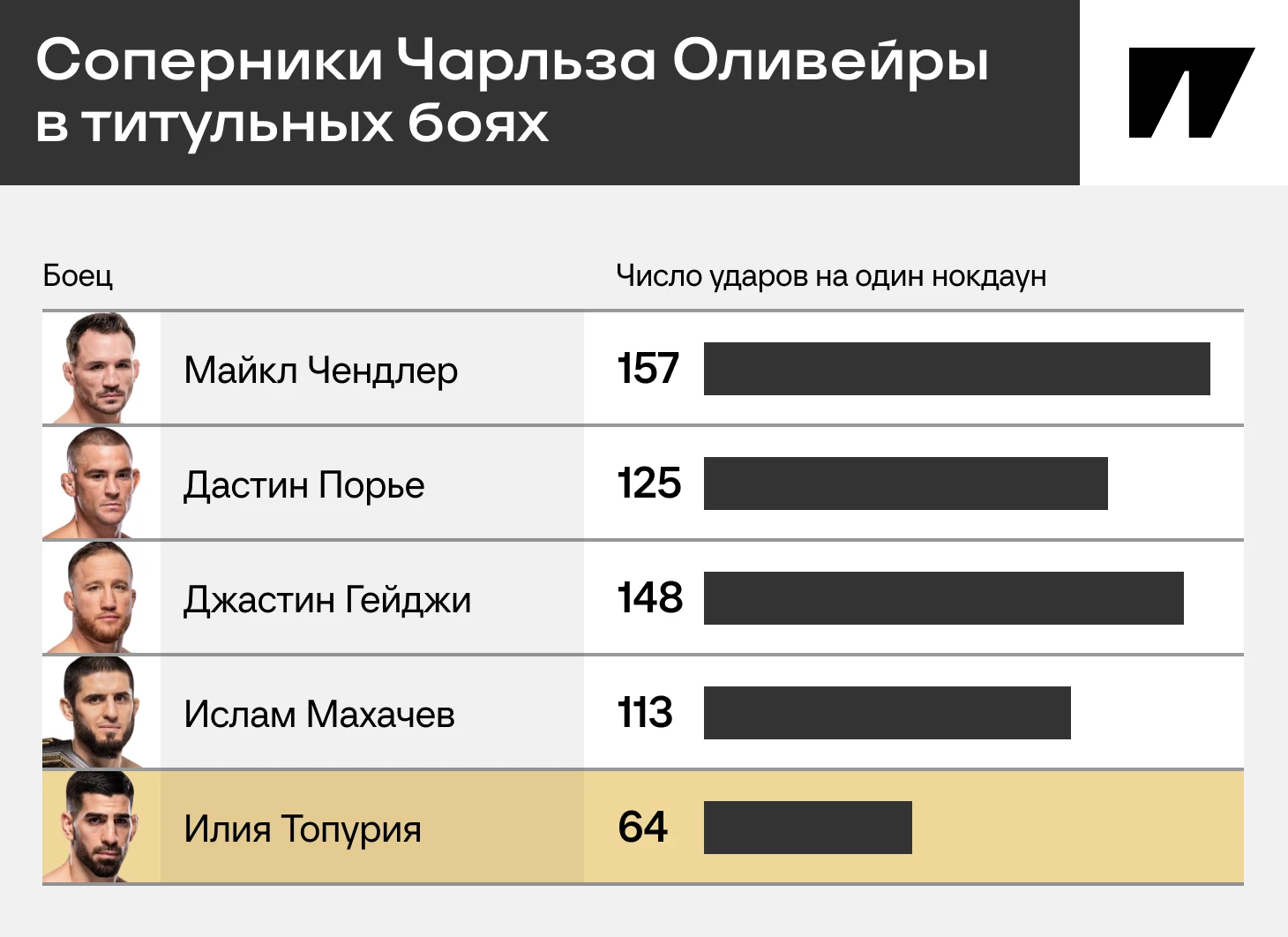 За исключением этих четырех поединков, у Оливейры всего два нокдауна за всю карьеру в UFC – против Каба Свонсона в 2012-м и Дэвида Теймура в 2019-м. Учитывая, что Оливейра провел целых 34 поединка в UFC, такая статистика совсем не кажется ужасной. Но проблема все равно есть.