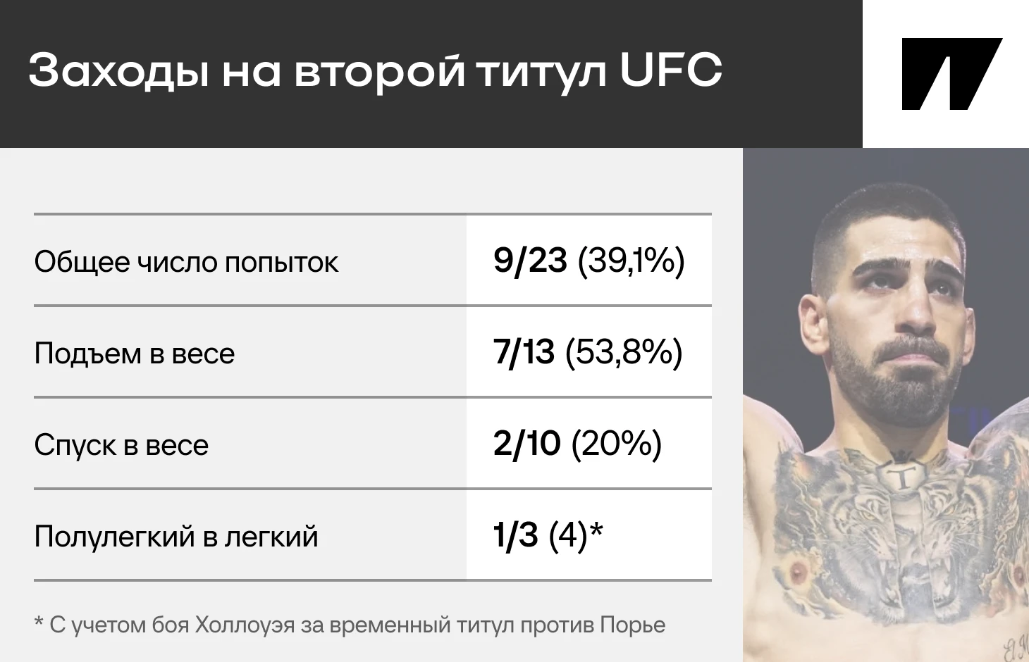 За всю историю UFC мы насчитали 23 попытки чемпионов и бывших чемпионов взять пояс в новой весовой категории. Из них девять оказались удачными – 39,1%. Первопроходцем стал Рэнди Кутюр – в 2003 году бывший чемпион в тяжелом весе спустился в полутяжелый, где сначала выиграл временный титул в поединке против Чака Лиделла, а затем стал неоспоримым, победив Тито Ортиса.