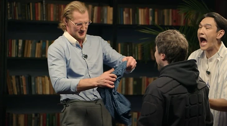 Спустя полчаса балагана Волкову дали начать историю, с которой он пришел (напомним, замысел шоу – гость рассказывает историю, не называет концовку, а комики должны ее добить). И рассказал, как его разозлил француз Сирил Ган, которому он проиграл раздельным решением судей на UFC 310 в декабре-2024.