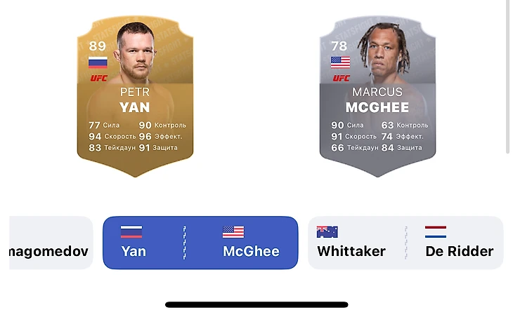 По данным Stats Fight Rating, бойцовский уровень Петра Яна выше, чем у Маркуса Макги. Его навыки оцениваются рейтингом 89. Представитель США отстает от россиянина на 11 пунктов, имея рейтинг 78.