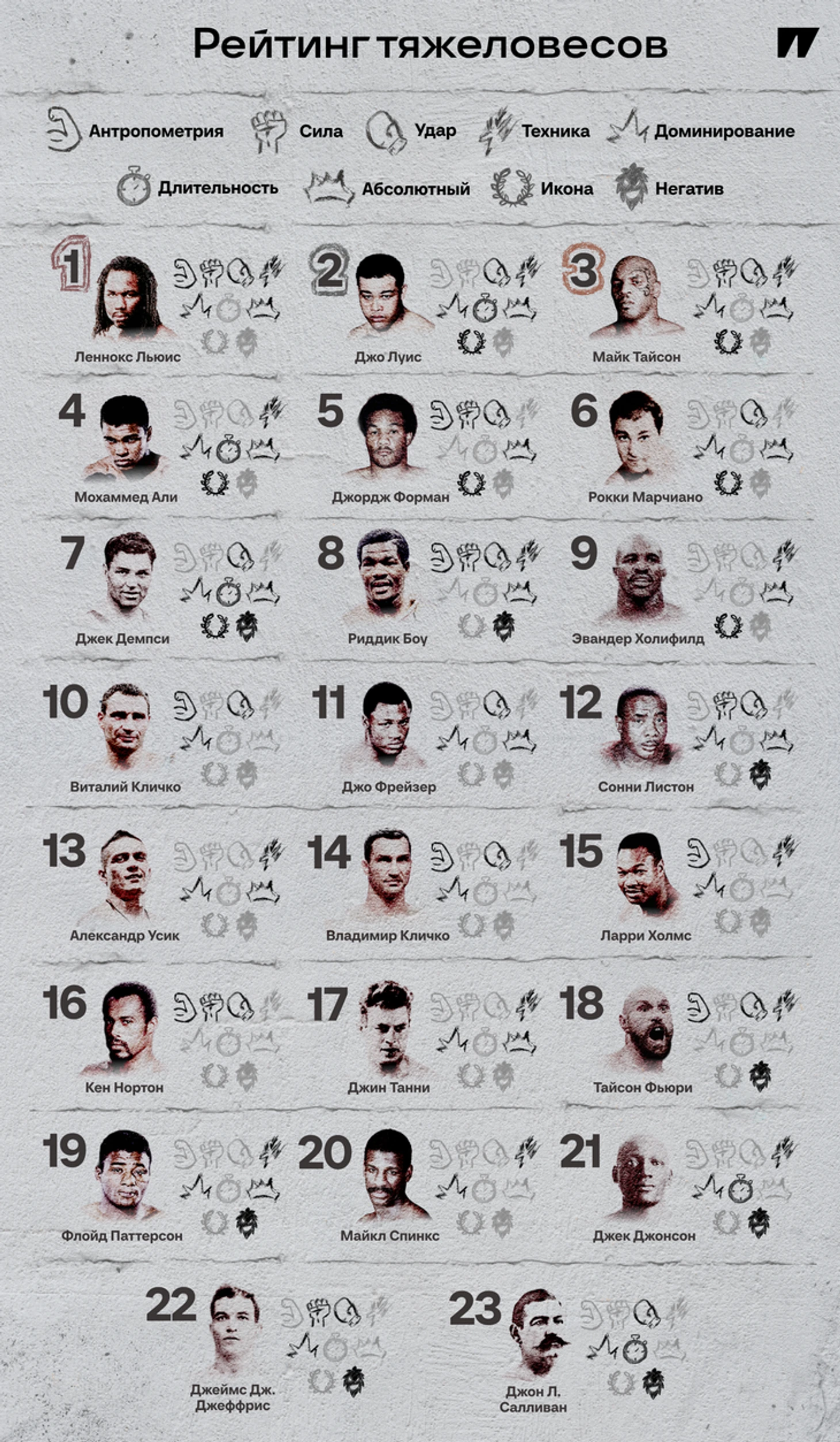 Мой лидер – Леннокс Льюис. Сочетание великолепной антропометрии (рост – 196 см, рич – 213 см), силы, разового удара (78% нокаутов), в том числе лучшего апперкота в истории тяжелого веса, и техники практически без изъянов делает его почти идеальным тяжеловесом, который пик на пик побил бы, пожалуй, любого тяжа в истории. Был хорош на любой дистанции – один из самых прагматичных чемпионов, склонный вытягивать максимум из антропометрии с минимумом риска.