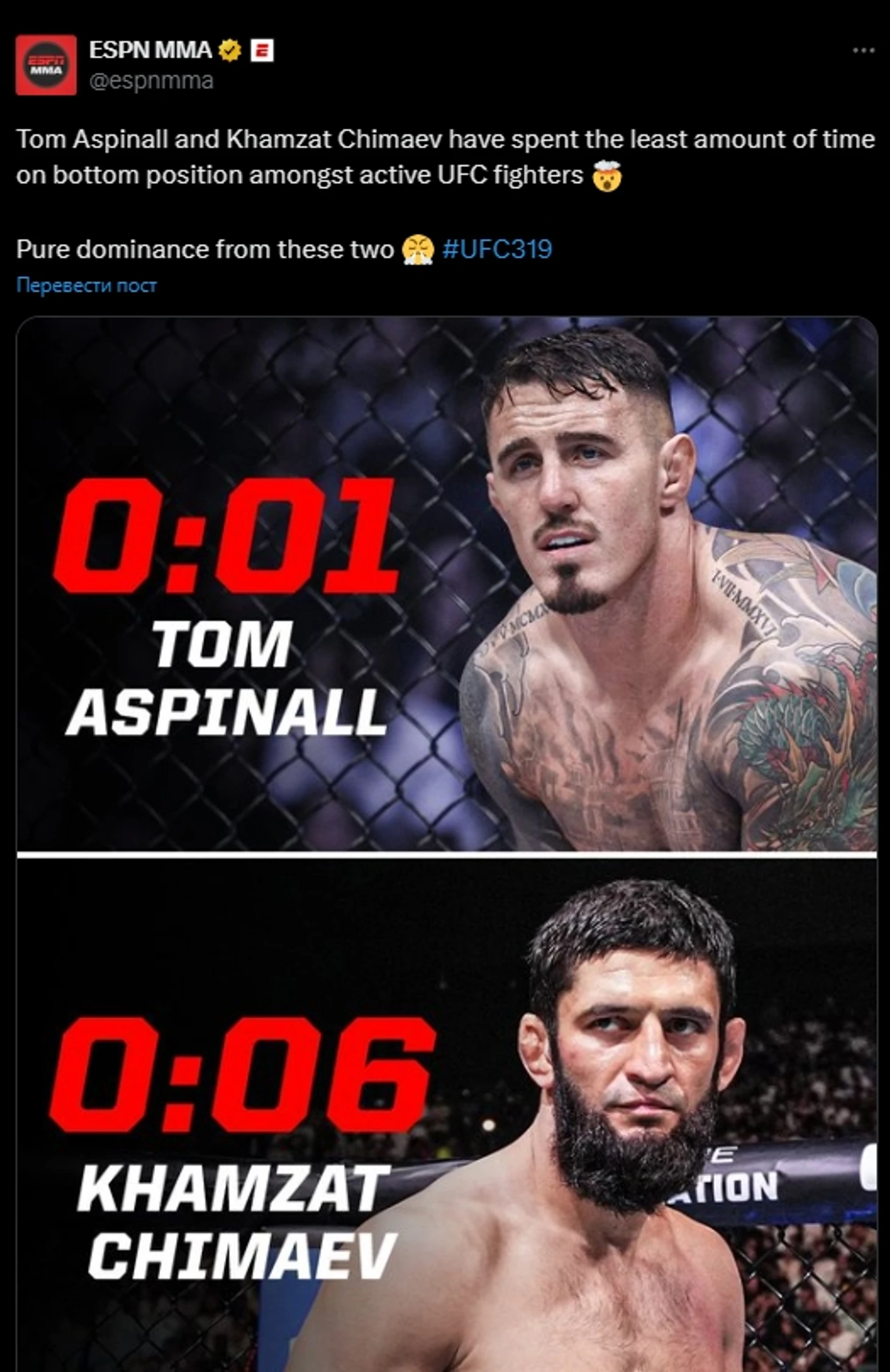 Аспиналл и Чимаев — два уникальных бойца, объединенных не только громкими именами, но и поразительным умением избегать уязвимых позиций в бою. За всю карьеру в UFC Том Аспиналл провел на спине всего одну секунду. И то, в поединке, завершившемся из-за травмы. Хамзат Чимаев лишь на шесть секунд дольше. И эти цифры – отражение их безупречного контроля и стратегического мышления.