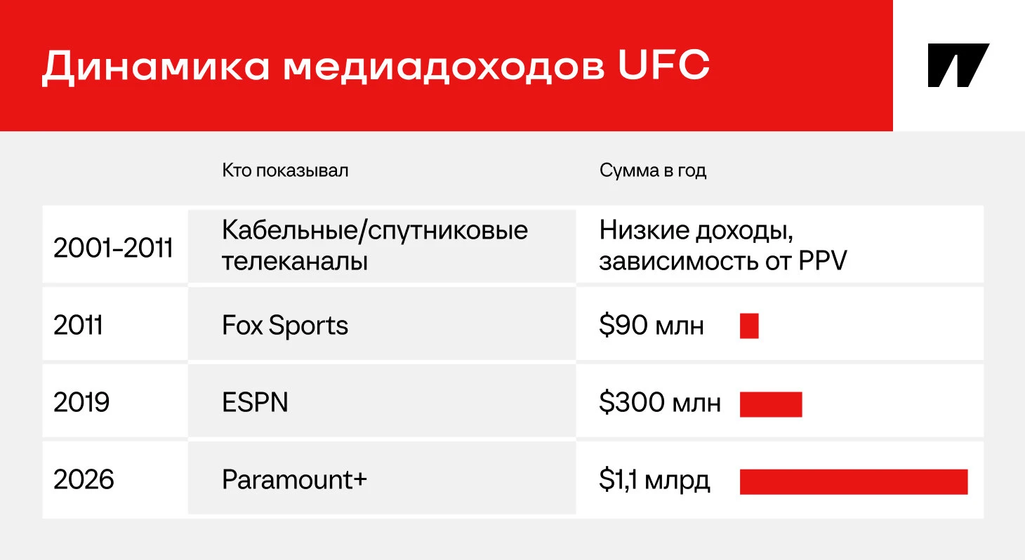 ● За несколько дней до сделки Paramount завершила слияние на $8 млрд со Skydance – американской медиапроизводственной и финансовой компанией, основанной в 2006 году Дэвидом Эллисоном. Skydance занимается производством кино, телешоу, видеоигр и спортивных развлечений. Перед сделкой с UFC Skydance и Paramount купили права на показ мультсериала South Park. Приобретение прав на UFC назвали первым крупным стратегическим шагом объединенной компании. Paramount конкурирует с Netflix и Disney, которые тоже активно инвестируют в спортивный контент.