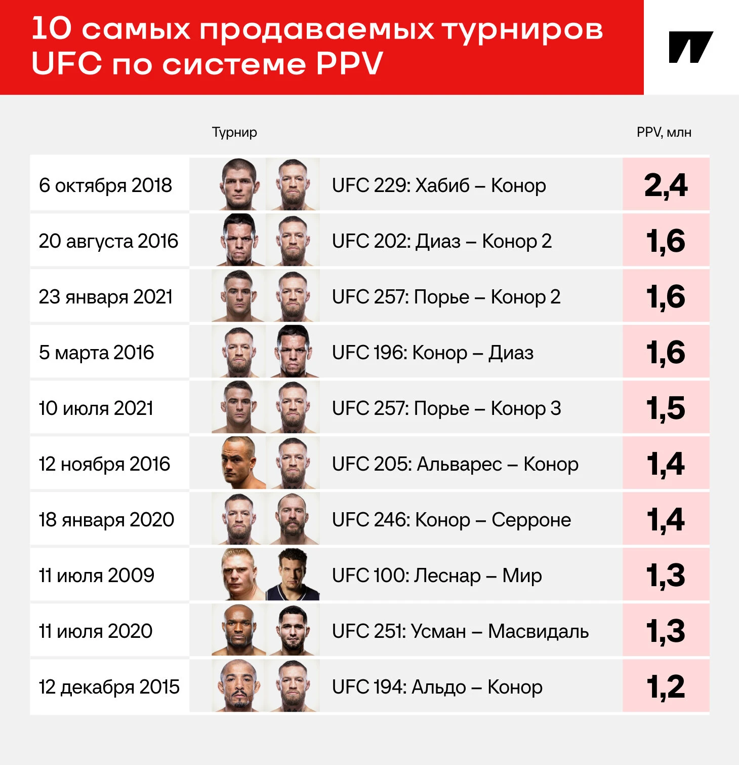 Какие турниры UFC стали самыми продаваемыми? Больше 2 млн пробивали только раз, а король продаж – конечно, Конор Макгрегор. Он и сам так себя назвал: «Прощай, UFC PPV. Горжусь тем, что служил королем». Так выглядит топ-10:
