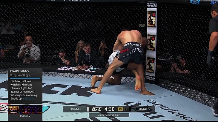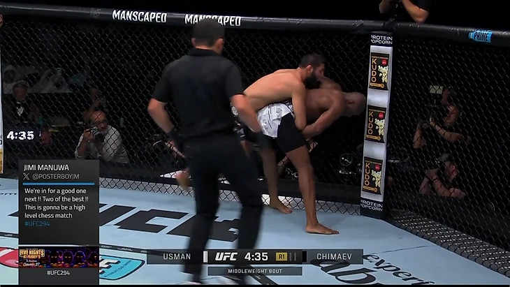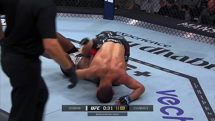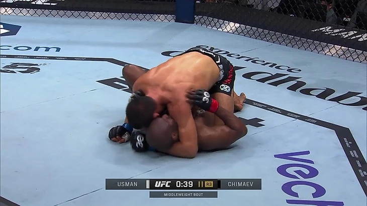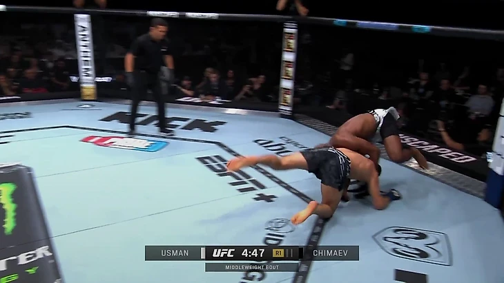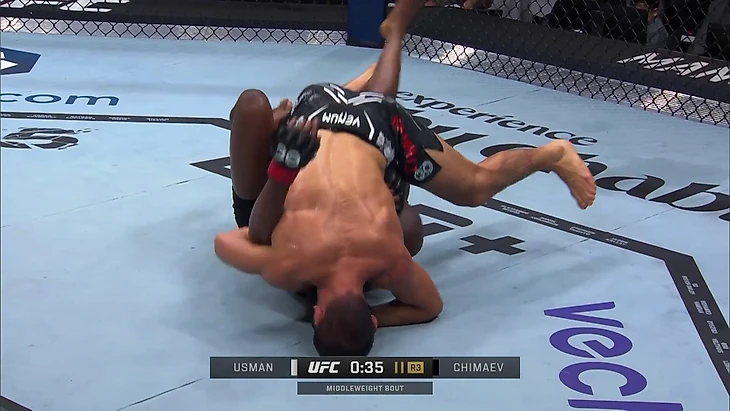 Спустя несколько секунд завязки Чимаев лишается контроля ногами, а Усман возвращается на ноги