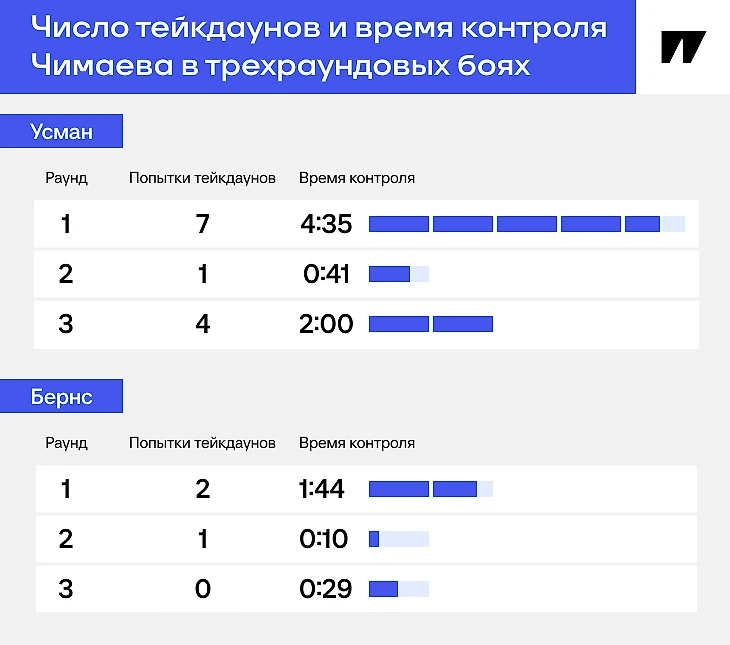 Два боя, которые действительно вызвали у Чимаева затруднения – против Бернса и Усмана. Мы подробнее разберем проблемы Чимаева в этих поединках позже, а пока лишь обратим внимание на любопытную статистику – число попыток тейкдаунов по раундам: