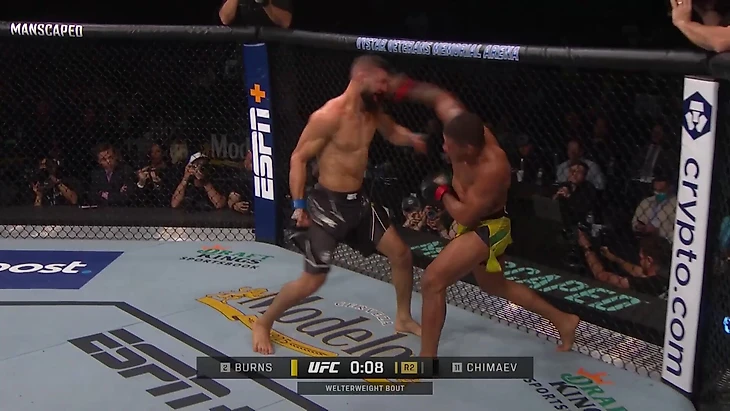 Другой момент: здесь уже огромная проблема с дистанцией. После трехударной комбинации Чимаев бьет джеб на расстоянии бокового от Бернса: