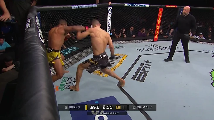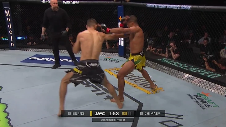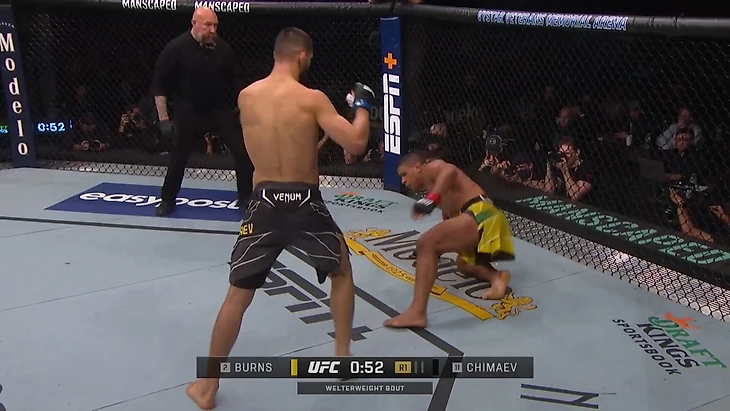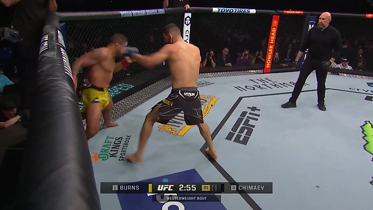 Чимаев зажимает Бернса у клетки и рассчитывает финишировать на последних секундах. Никаких мыслей о защите:
