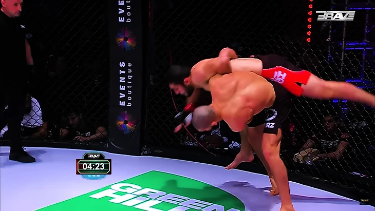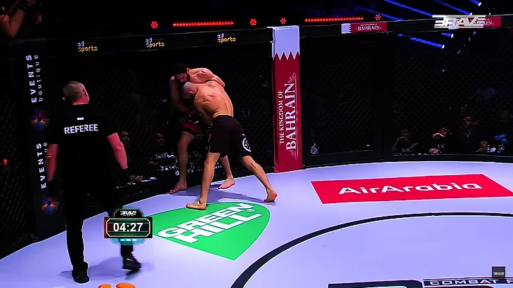 Но это не конец. Чимаев продолжает идти вперед, выдергивает одну ногу и делает подсечку – вам снова удается не упасть. Кажется, что все хорошо, но нет – он закрывает замок на корпусе и забирает спину. Теперь Чимаев дома – отсюда он может развивать атаку.