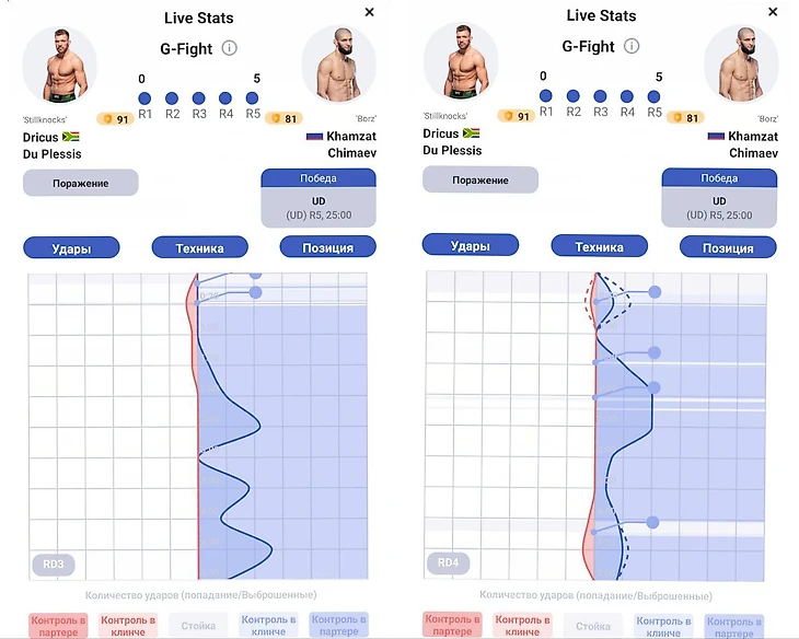 Судьи на основе искусственного интеллекта отдают оба раунда чеченцу – 10:9. Ознакомится с ИИ-оценками боев всего турнира UFC можно в приложении (доступно в AppStoreи Google Play) А экран “Динамика поединка” в приложении Stats Fight лишь подтверждает доминирование от Чимаева в этих отрезках: