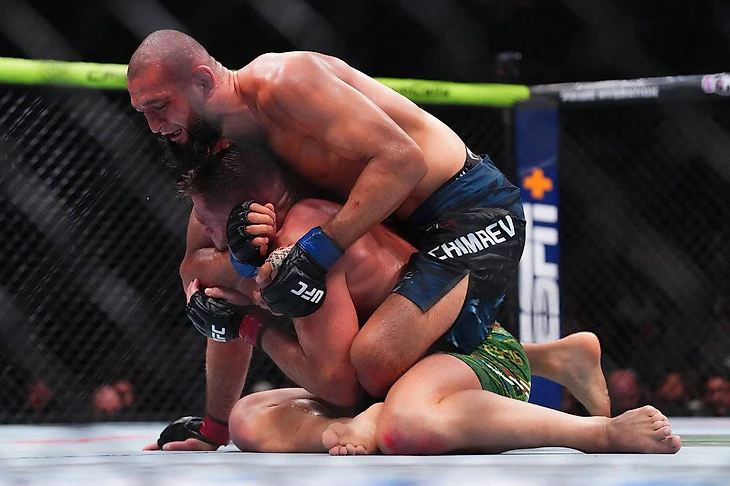 Ожидаемо, Чимаев решил не изменять своему стилю: уже на первых секундах Хамзат идет за тейкдауном и переводит Дю Плесси на настил, где контролирует чемпиона до конца первой пятиминутки, нанося многочисленные удары руками с небольшой амплитудой. Во втором раунде ситуация практически повторяется, лишь с тем отличием, что “Борз” удерживает соперника у сетки, а удары наносит в основном коленями.