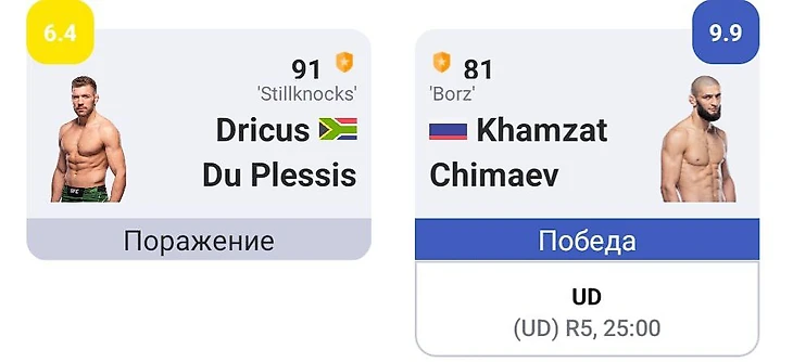 Хамзат Чимаев показал прекрасное выступление (разгром со счетом 247-25 по акцентированным ударам и 21,5 минут контроля в борьбе говорят за себя). Такого уровня доминации в титульном поединке UFC мы не видели давно! Алгоритм Stats Fight Performance по достоинству оценил победу чеченца, наделив его рейтингом 9.9. Дрикус Дю Плесси получил скромную оценку 6.4 за минувший поединок.