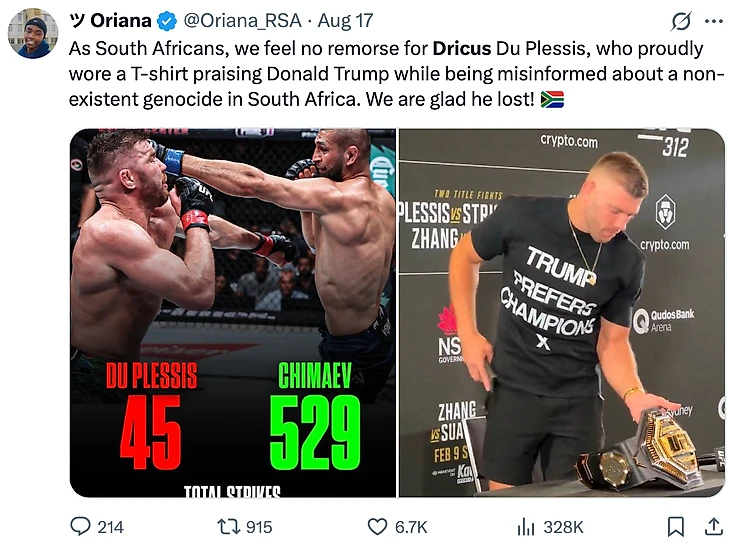 💭 «Он поддерживал Трампа и ложный геноцид белых в ЮАР, а Хамзат тренировался».