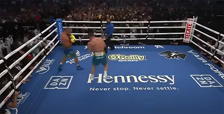4. Разнообразная работа вторым номером. Он может встретить коротким ударом по корпусу на средней дистанции, как это было в бою за абсолютное чемпионство против Джулиуса Индонго. Или нанести прямые удары со смещениями в бок, что неоднократно исполнял против Джеффа Хорна.