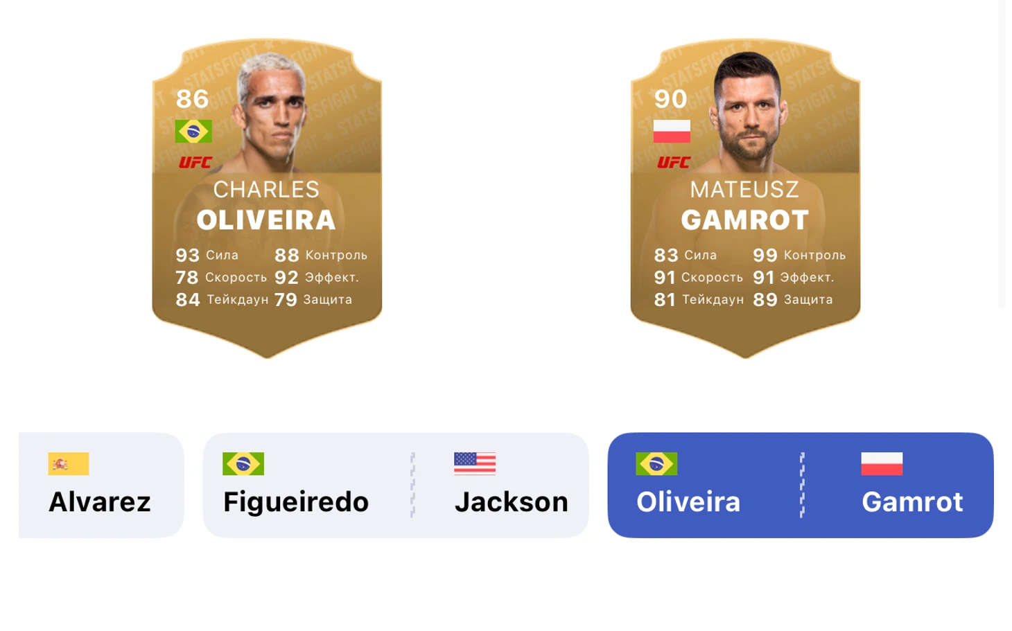 По данным Stats Fight Rating, бойцовский уровень Гамрота выше, чем у представителя Бразилии. Навыки польского бойца наделены рейтингом 90. Чарльз Оливейра отстает в этом компоненте от Матеуша на 4 пункта.