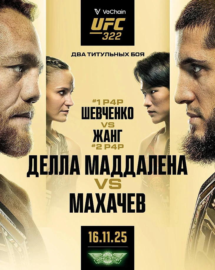 Турнир UFC 322 пройдёт в ночь на 16 ноября в Нью-Йорке на арене Madison Square Garden. Начало шоу — в 02:00 мск (ранние прелимы), основной предварительный кард стартует в 04:00 мск, мэйн-кард — в 06:00 мск. В главном бою за титул чемпиона UFC в полусреднем весе сразятся Джек Делла Маддалена и Ислам Махачев, в со-главном бою определится обладательница пояса в наилегчайшем весе — Валентина Шевченко против Чжан Вэйли. Трансляция в России будет идти на Кинопоиске и «Матч ТВ».