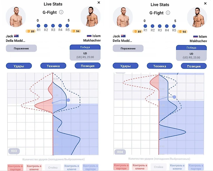 Доминация Ислама была очевидна. Судьи на основе искусственного интеллекта в приложении Stats Fight оба этих раунда с одинаковым счетом отдали Махачеву – 10:9. Ознакомится с ИИ-оценками боев всего турнира UFC можно в приложении, доступно в AppStore и Google Play.