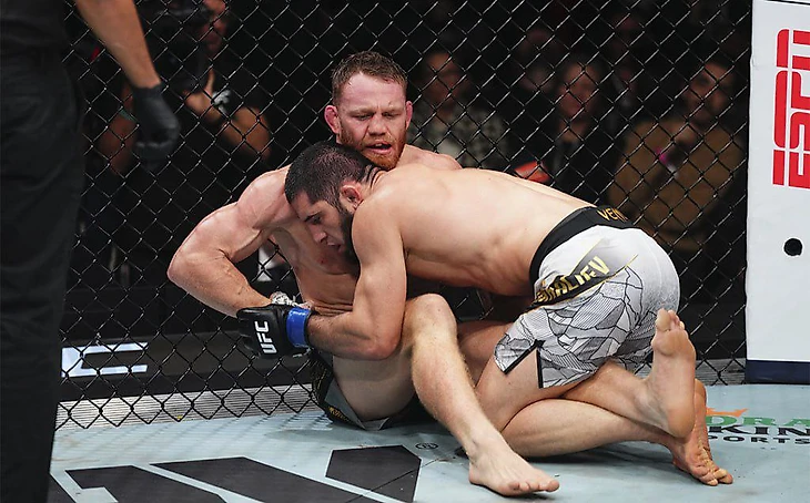 Статистика по итогам двух раундов боя оказалась красноречивой: 7 минут и 17 секунд контроля в партере за Махачевым, а по статистике акцентированных ударов – 40:5 в пользу дагестанца!
