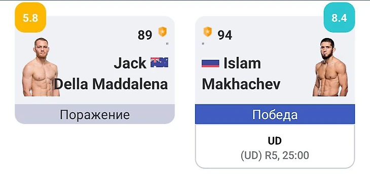Алгоритм Stats Fight Performance по достоинству оценил доминирующее выступление Ислама Махачева, получившего рейтинг 8.4 за минувший поединок. Что касается Джека Деллы Маддалена, то он напрочь провалил бой. Австралиец достиг скромного рейтинга 5.8.