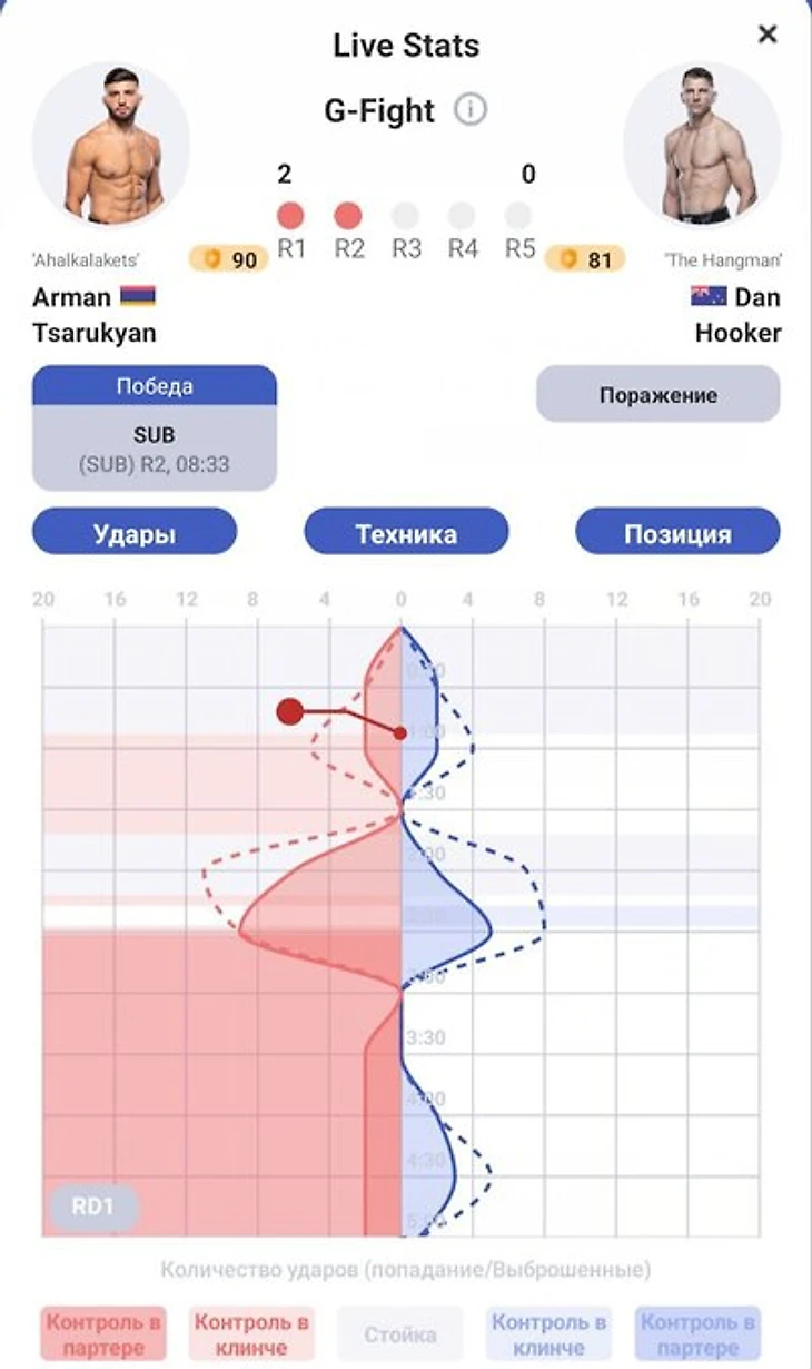 Судьи на основе искусственного интеллекта в приложении Stats Fight закономерно отдали первый раунд Царукяну – 10:9. Графика стартовой 5-минутки отлично показывает, насколько велик был перевес Армана: