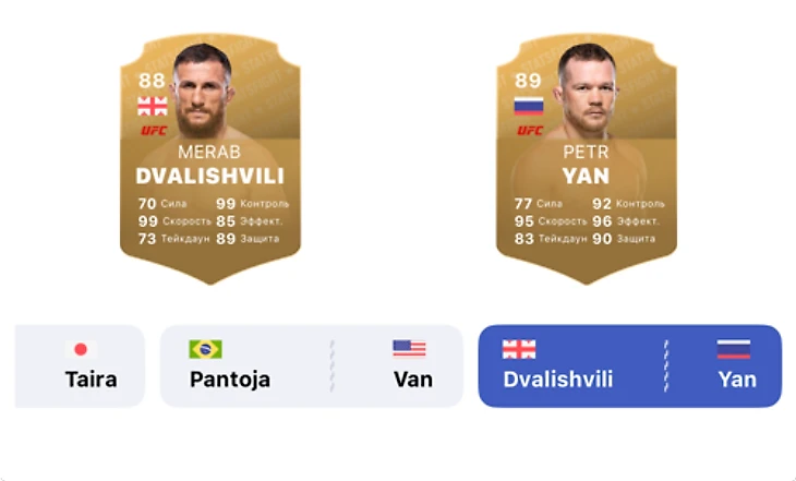 Собираешь команду бойцов турнира, выбираешь метод победы, добавляешь геймплан — и получаешь монеты за точные прогнозы. Прокачивай профиль, открывай карточки бойцов и показывай друзьям, кто реально понимает единоборства.