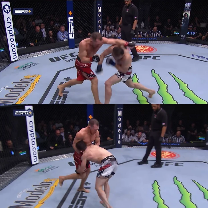 Но смена стойки лишь помогла Мерабу: кросс Яна проходил по касательной, а соперник нырял в ногу, которая в стойке левши располагалась еще удобнее – по траектории движения. Там была зона безопасности: правой рукой Ян не мог ни ударить, ни толком надавить на затылок для защиты.