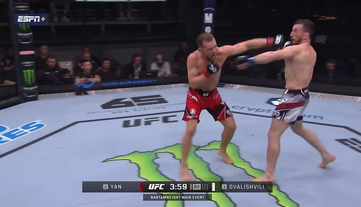 Дальше Ян не просто редко бил правой – он ее почти не подключал. При этом не выглядел одноруким бойцом – комментаторы UFC ничего не заметили. К концу раунда Ян разозлился и выбросил единственный в бою сильный акцентированный удар правой рукой в голову. Попал после левой в корпус, но Мераба не потряс – тот продолжил идти вперед.