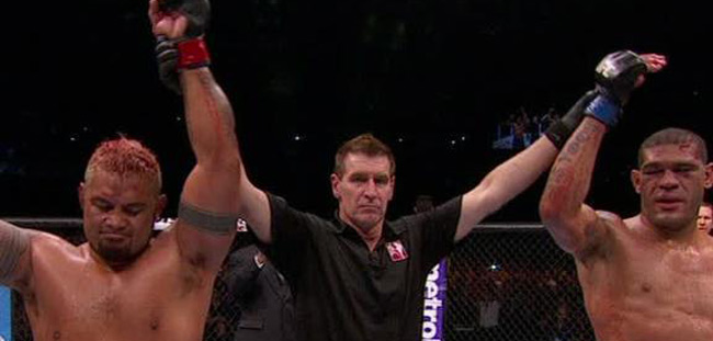 Глядя на этот бескомпромиссный матч, захотелось, чтобы никто не упал, так как оба были достойны победы. Перед нами предстали два настоящих воина: никто не хотел уступать, никто не хотел падать. Сил практически не осталось, и до финального гонга атлеты выстояли, в прямом смысле, на морально-волевых качествах. Когда всё закончилось зал буквально «взорвался», стоя приветствуя участников главного поединка. Силва и Хант настолько высоко подняли планку и настолько ровно шли в этом матче, что была объявлена ничья по решению большинства судей: 48-47, 47-47, 47-47 – таков был счёт судейских карточек. Это было справедливо, так как ни один из этих двух крепких тяжеловесов не заслужил поражения, оба выложились по полной программе. Разумеется, Силва и Хант получили ещё и бонус по $50 000 за лучший бой турнира! Можно только догадываться, как радовался господин Дэйна Уайт после такого феерического шоу.