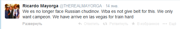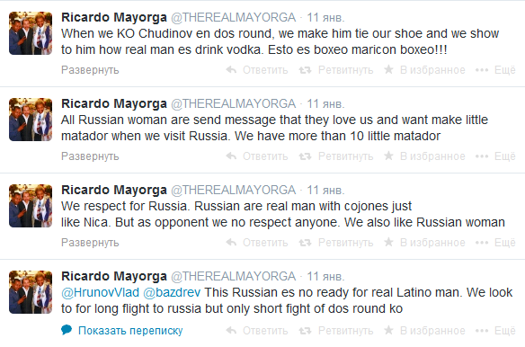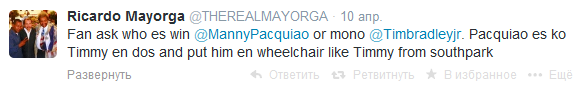 Чемпионские бои не дают за ведение твиттера. В противном случае на HBO мы бы уже давно лицезрели, как Маша из Омска в ринге пытается выцарапать глаза Полу Биссонетту. Все эти "отшлепаю как шлюху", "KO en dos", "mono | playo | maricon | homo", "нам нужен новый мешок", "мексиканские ссыкуны", "фаны должны написать письма в спортолото" - это уже не так смешно как раньше. И даже открытие для себя "Южного парка" - это пузыри со дна болота.