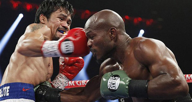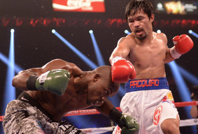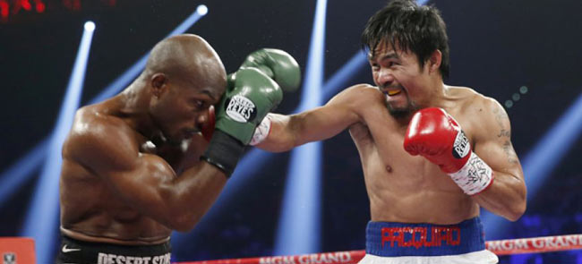 А тут ещё и Брэдли удалось пошатнуть Пакьяо точным правым в четвёртом раунде! Оказался филиппинец потрясён или просто разбалансирован утверждать не возьмёмся, но интрига уже начала переливаться через край. Донельзя уверенный в себе, Тимоти продолжил прессовать несколько растерявшегося филиппинца и вскоре ещё раз приложился справа, но теперь уже без весомого визуального эффекта. В пользу Мэнни была отменная подвижность – именно за счёт перфектной работы ног уходил он от большинства выпадов решительно настроенного соперника.