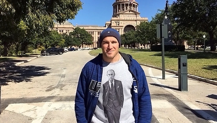 Перед поединком в американском Остине украинский боец Алексей Олейник решил взбодрить местную публику, выйдя на процедуру взвешивания, которая обычно проходит при большом скоплении публики и телекамер, в футболке с изображением президента России Владимира Путина.