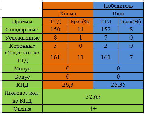Бойцы выполнили четырнадцать усложненных приемов, но половина из них это удары головой. Конечно, все эти удары были опасные, но прежде всего для здоровья наносящего удар, а не принимающего. Остальное время рестлеры обменивались обычными ударами и чопами, которых сделали штук по сто на товарища. Такая ситуация, при старой системе подсчета возводила этот матч во что-то сверхъестественное. Поэтому мне пришлось изменить базовый параметр подсчета.