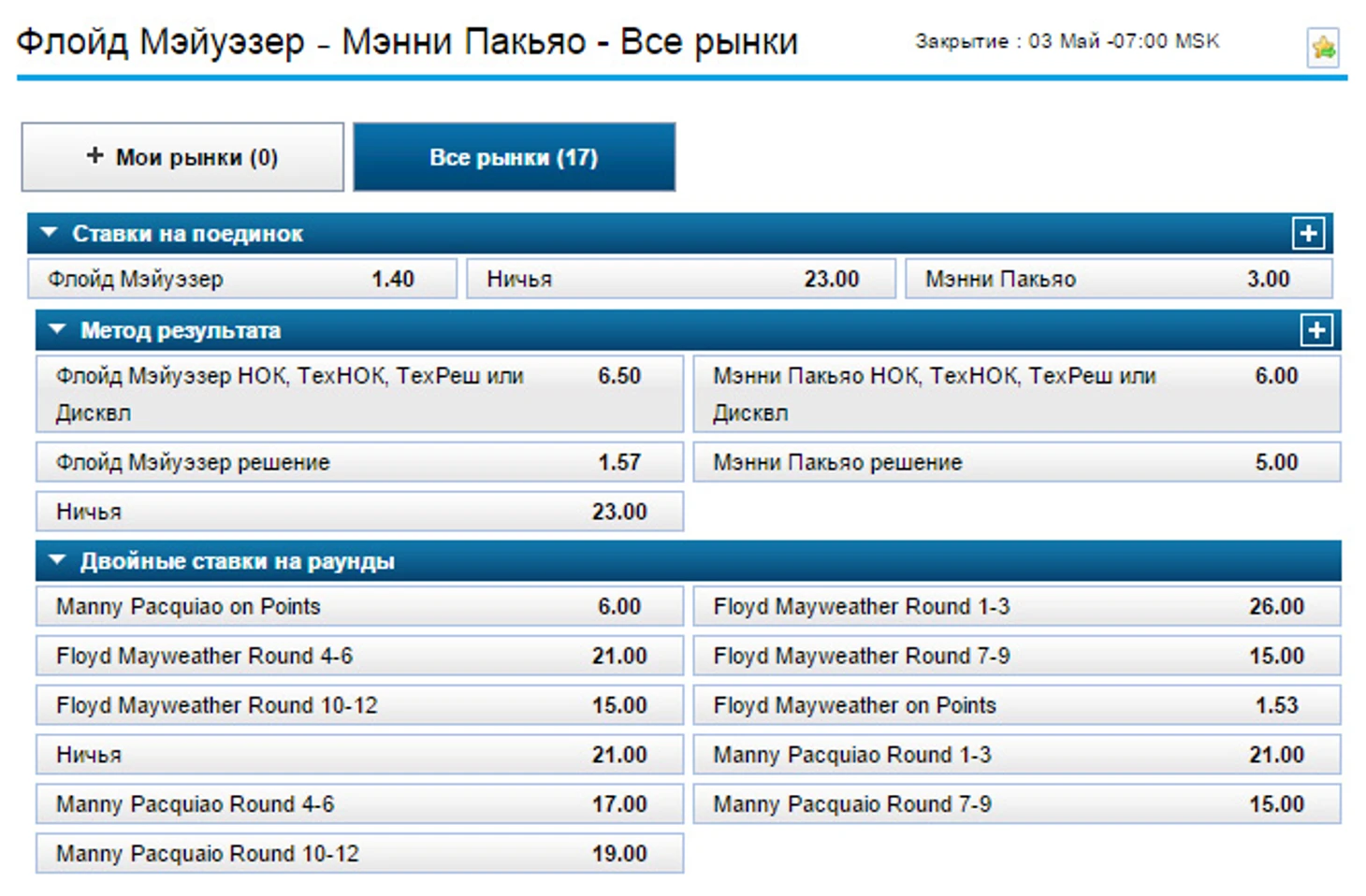 Таким образом, поставив сегодня 1,6 миллиона долларов на победу Мэйвезера (кэф 1.40), Джексон в случае успеха Флойда 2 мая заработает 640 000 долларов.