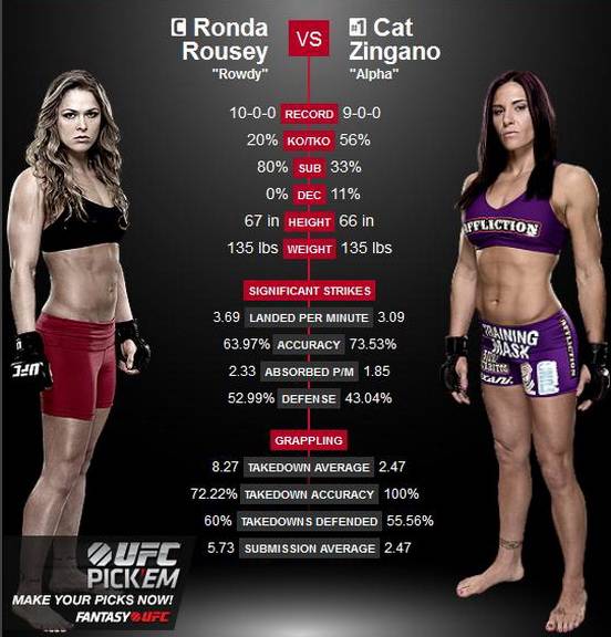 Это второй поединок Ронды (4-0), в котором ей противостоял ранее не побежденный боец. Кэт Зингано имела рекорд в организации 2-0.