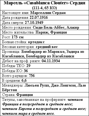 7 октября 1937 года можно считать вторым дебютом Сердана. «Бомбардир из Касабланки», как его весьма метко прозвали за бескомпромиссное поведение в ринге, впервые выступил в столице Франции, выиграв по очкам у ничем не примечательного Луи Жамптона (6-6-1, 0 КО; здесь и далее – на момент боя). Это не был лучший поединок Марселя. Но публика, тем не менее, приняла его сразу. Её ожидания не обманулись. И дело даже не в том, что на счету Сердана было уже 29 побед и ни одного поражения. И не только в том, что его боевые перформансы редко оставляли кого-нибудь равнодушным.