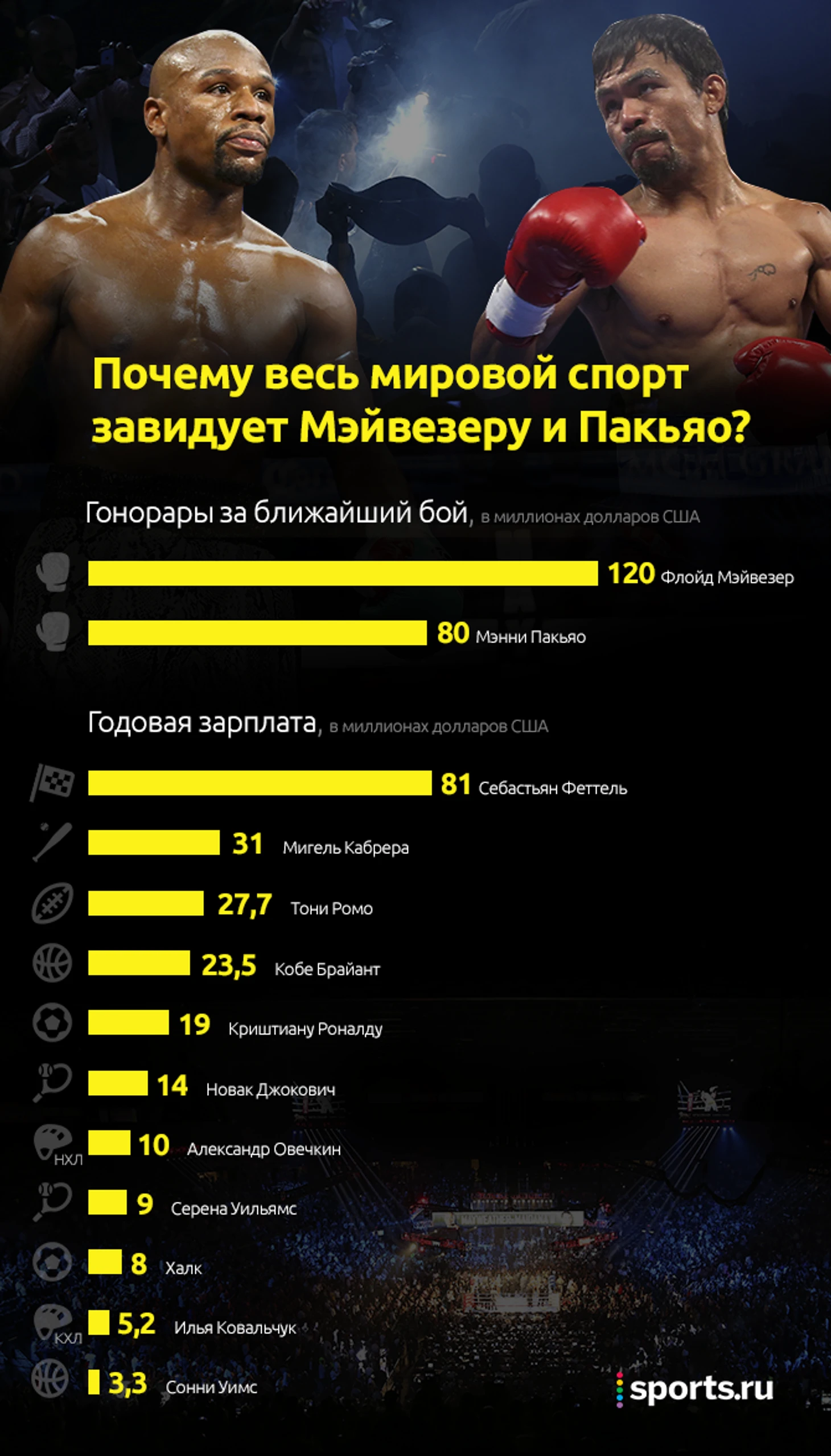 18.55. Перед боем Sports.ru сравнил гонорары Пакьяо и Мэйвезера и звезд из других видов спорта.