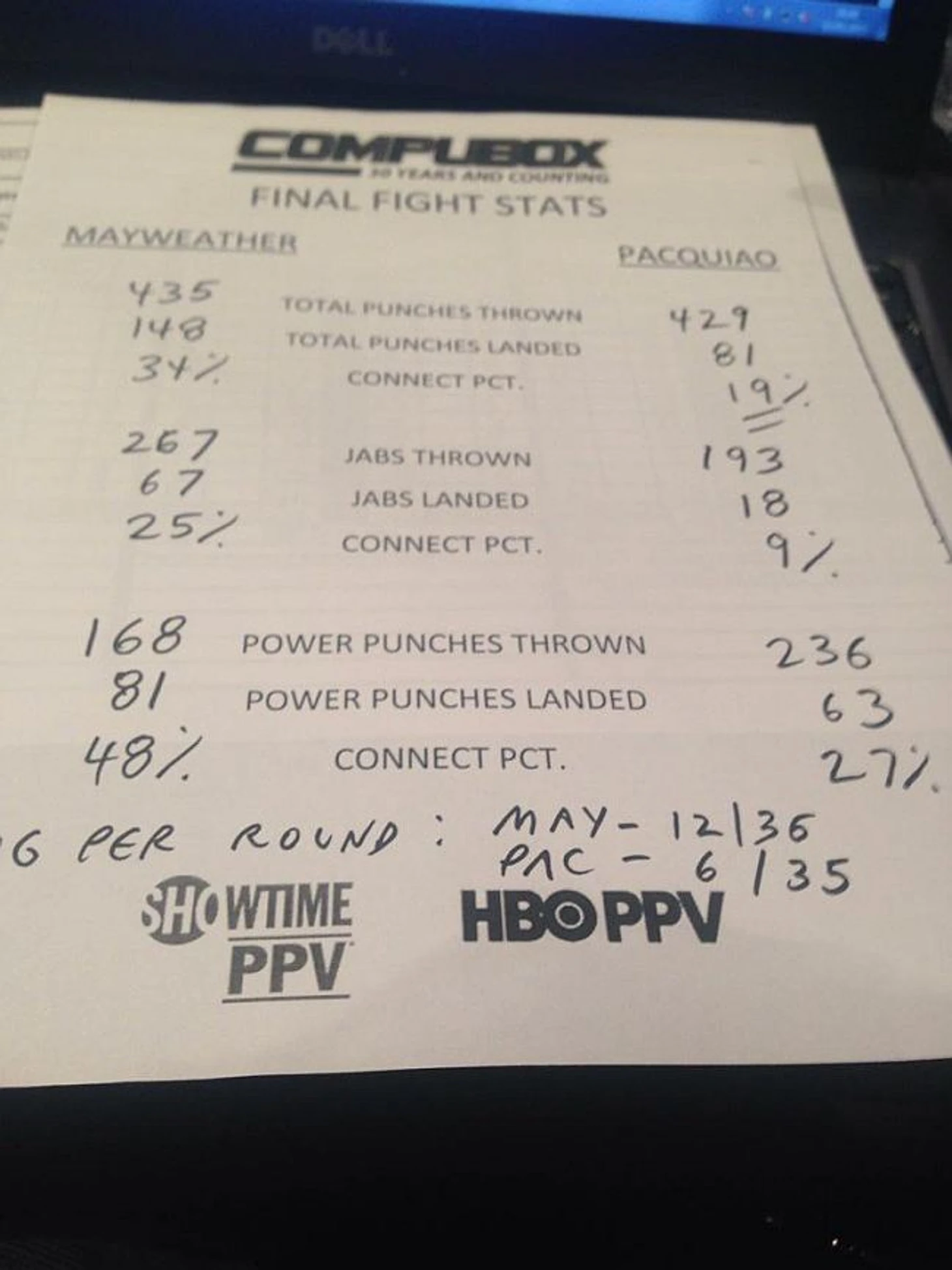 Из 435 ударов Мэйвезера цели достигли 148. Пакьяо выбросил 429 ударов, попал 81 раз.